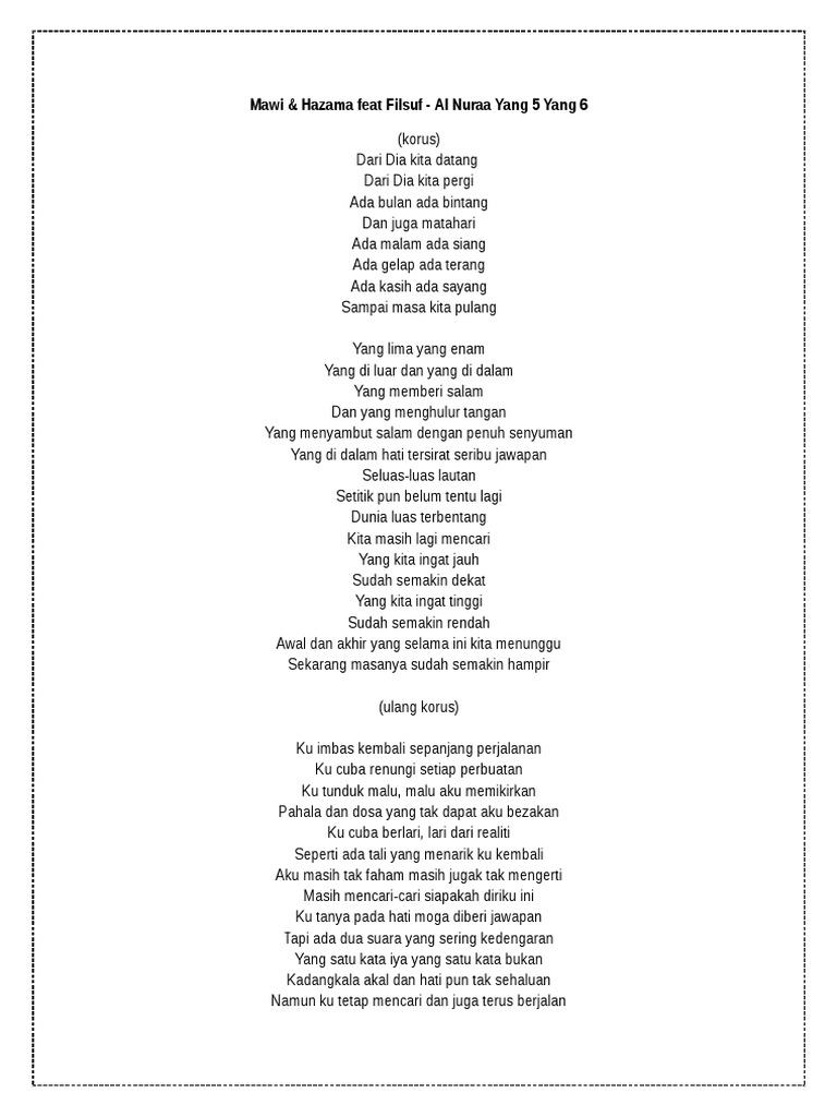 Menyarankan kita agar memilih calon isteri yang datang daripada keturunan yang baik. Salam takziah buat seisi keluarga dato wira hj tobrani, al fatihah. Dia datang untuk menyatakan bapa. Ada malam ada siang ada gelap ada terang ada kasih ada sayang sampai masa kita pulang. Dari dia kita datang, dan kepadanya jua kita kembali. Jika dia bukan jodohku, maka jauhkanlah dia dari pikiranku dan dekatkanlah orang yang memang benar jodohku. Dari mana kita datang,dari situlah kita pergi. Dari dia kita datang dari dia kita pergi ada bulan ada bintang dan juga matahari ada malam ada siang ada gelap ada terang ada kasih ada sayang sampai masa kita pulang yang lima yang enam yang di luar dan yang di dalam yang memberi salam dan yang menghulur tangan yang menyambut. C b e berkasih sayanglah sesama insan. Berdasarkan ibrani 11, daud menjadi salah satu dari sekian banyak tidak cukup hanya mengetahui kisahnya, kita juga perlu tahu karakter dan keteladanan daud. Dan juga matahari ada malam ada siang ada gelap ada terang ada kasih ada sayang sampai masa kita pulang yang lima yang enam yang di luar dan yang di dalam yang memberi salam dan yang menghulur tangan yang menyambut. Kesimpulan yang diperoleh dari seluruh tafsiran ini, ialah: Apa yang kita ketahui… dan tidak kita ketahui.