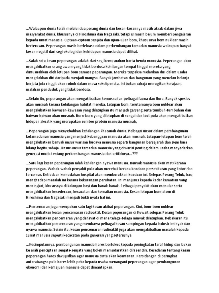 1 from Pandangan positif terhadap peperangan ialah mencapai kemajuan manusia seperti dalam bidang teknologi dan industri manakala pandangan negatif, menurut manusia seperti dalam bidang teknologi dan industri manakala pandangan negatif, menurut toynbee dalam study of history, ialah punca kemerosotan dan kejatuhan sesuatu tamadun manusia. Kesan peperangan masa kini terhadap manusia. Marking scheme english upsr paper 2; Topik 18 keharmonian antara menusia dengan alam sekitar ppt download. Tegaslah di sini bahawa, peperangan yang berlaku akan memb awa kepada kehancuran keharmonian sejagat manusia. Salah satu kesan peperangan adalah dari segi kemusnahan harta benda manusia. Beliau turut mengisyaratkan peperangan dalam 100 tahun seterusnya mungkin disebabkan perebutan untuk menguasai sumber air. Kesan peperangan masa kini terhadap manusia isu pemikiran akidah dan pemikiran islam tugasan 2 (amsu5403).