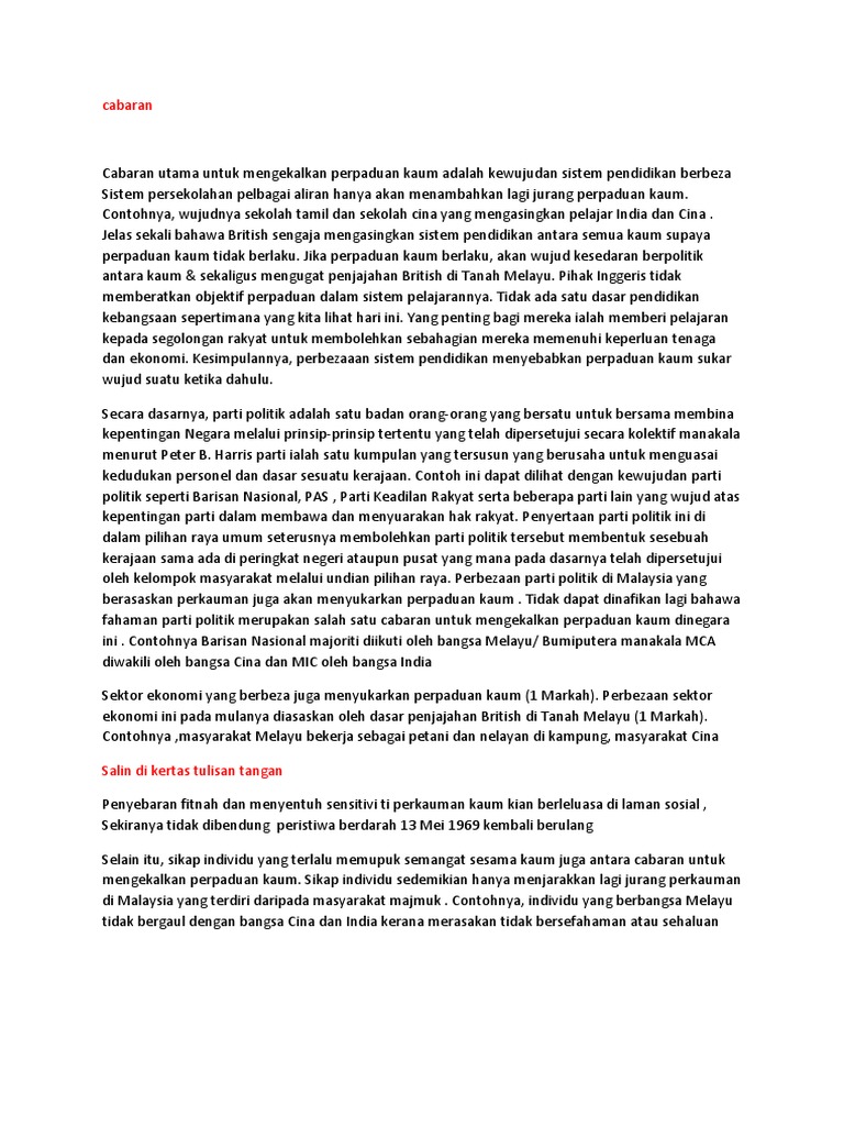 Perpaduan Kaum Pt3 Sejarah Docx from demo.pdfslide.net Malaysia adalah sebuah negara yang penduduknya terdiri dari pelbagai kaum yang mengamalkan cara hidup yang tersendiri. Malaysia merupakan sebuah negara yang unik kerana masyarakatnya terdiri daripada berbilang kaum dan agama. Contoh karangan semangat kejiranan yang terbaik. Perpaduan ialah 1 proses yang. Berdasarkan amalan ini menteri besar kelantan, dato' nik aziz nik mat telah mencadangkan. Orang melayu malaysia, terdiri daripada 55% jumlah penduduk di malaysia, ditakrifkan secara umum sebagai bangsa melayu berbanding lebih spesifik. Kaum melayu, cina, india dan rakyat peribumi yang lain dapat hidup dalam keadaan yang aman dan damai malah saling menghormati. .perpaduan di malaysia peristiwa berdarah 13 mei 1969 penjajahan british melalui dasar pecah dan perintah serta mementingkan kuasa dan ekonomi menyebabkan terjadi jurang perbezaan dan pengenalan ekonomi berbentuk etnik antara kaum dan wilayah.